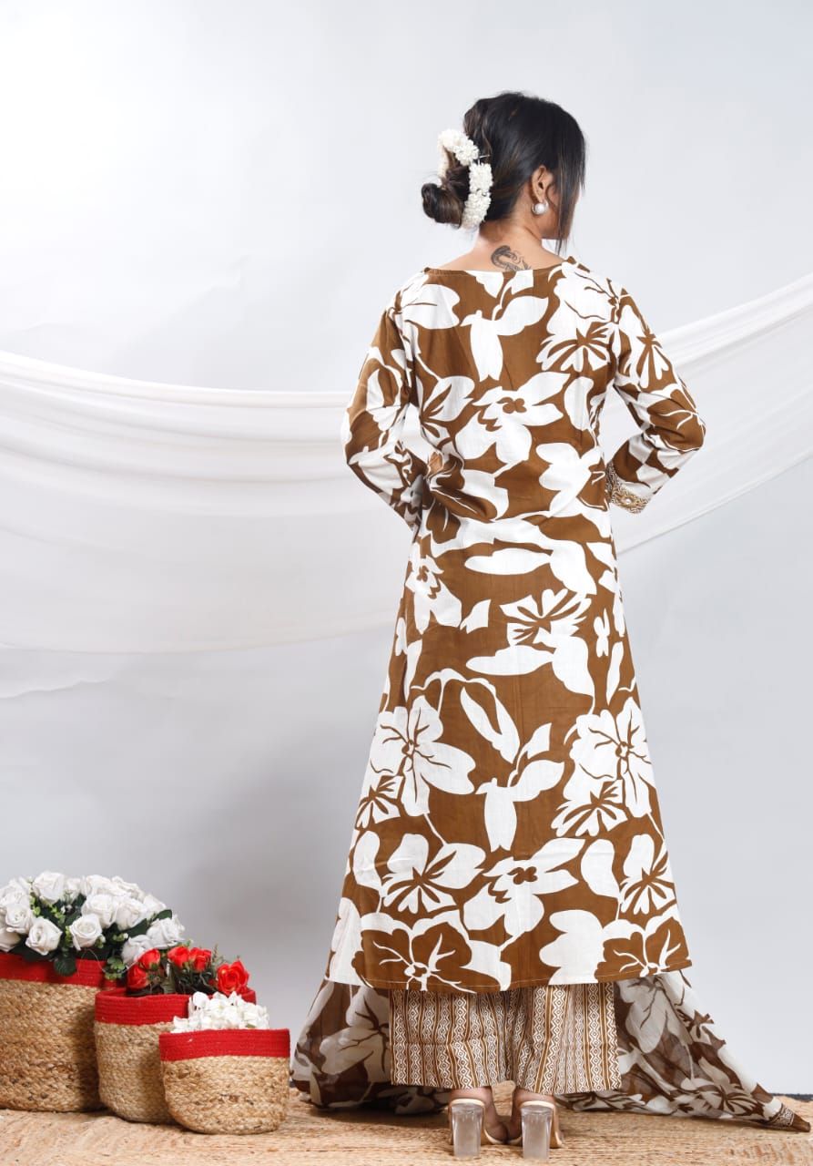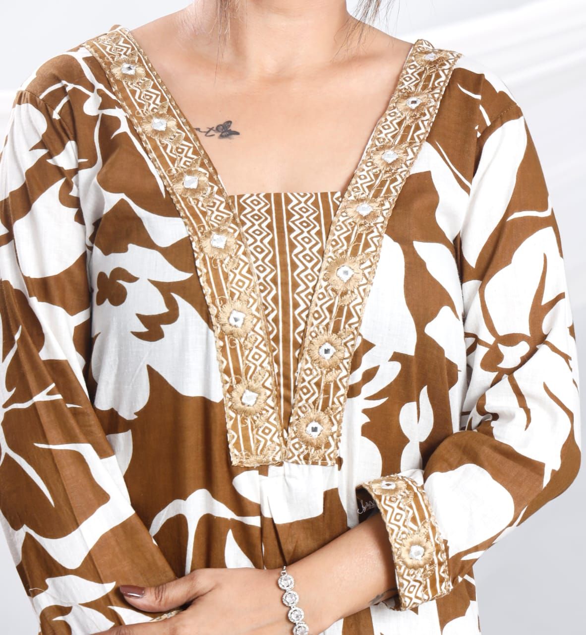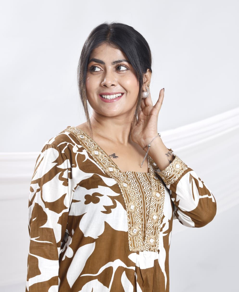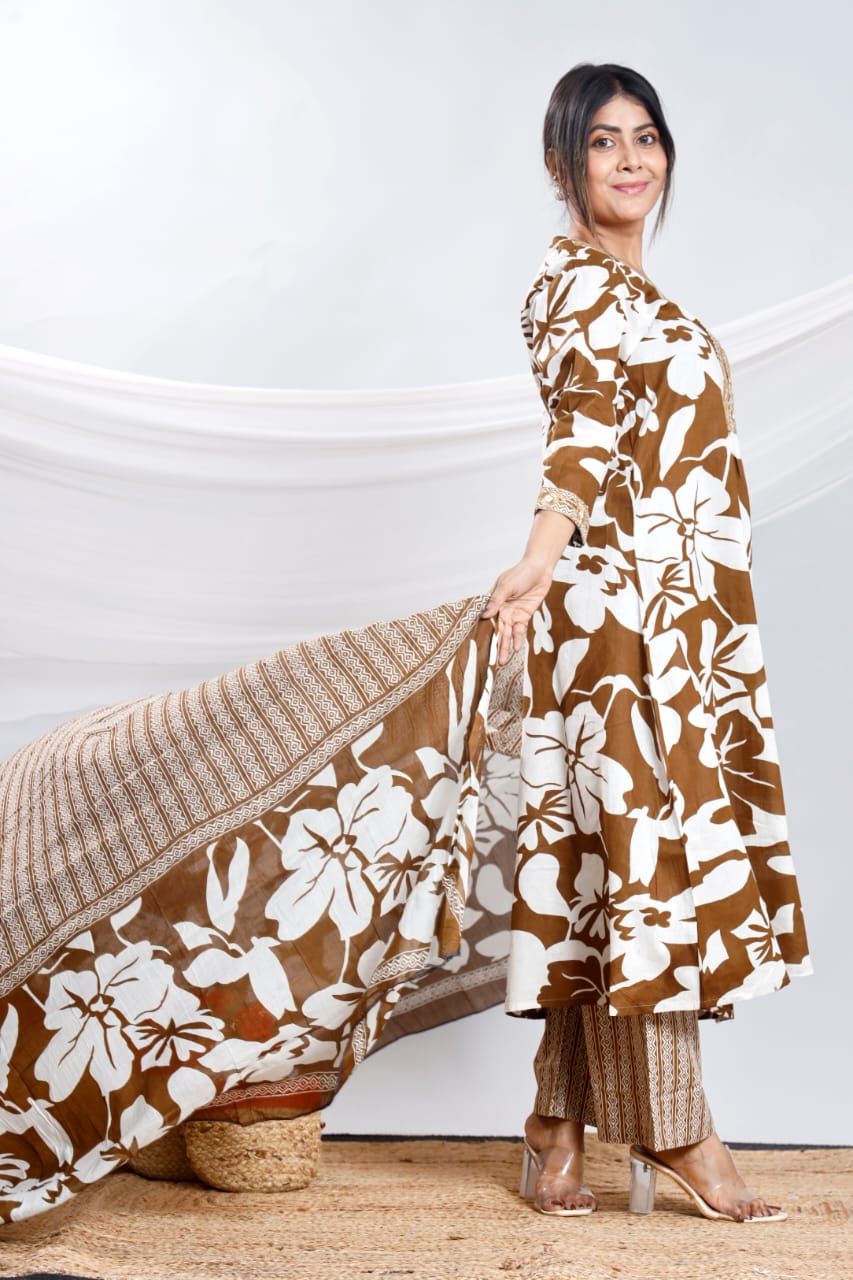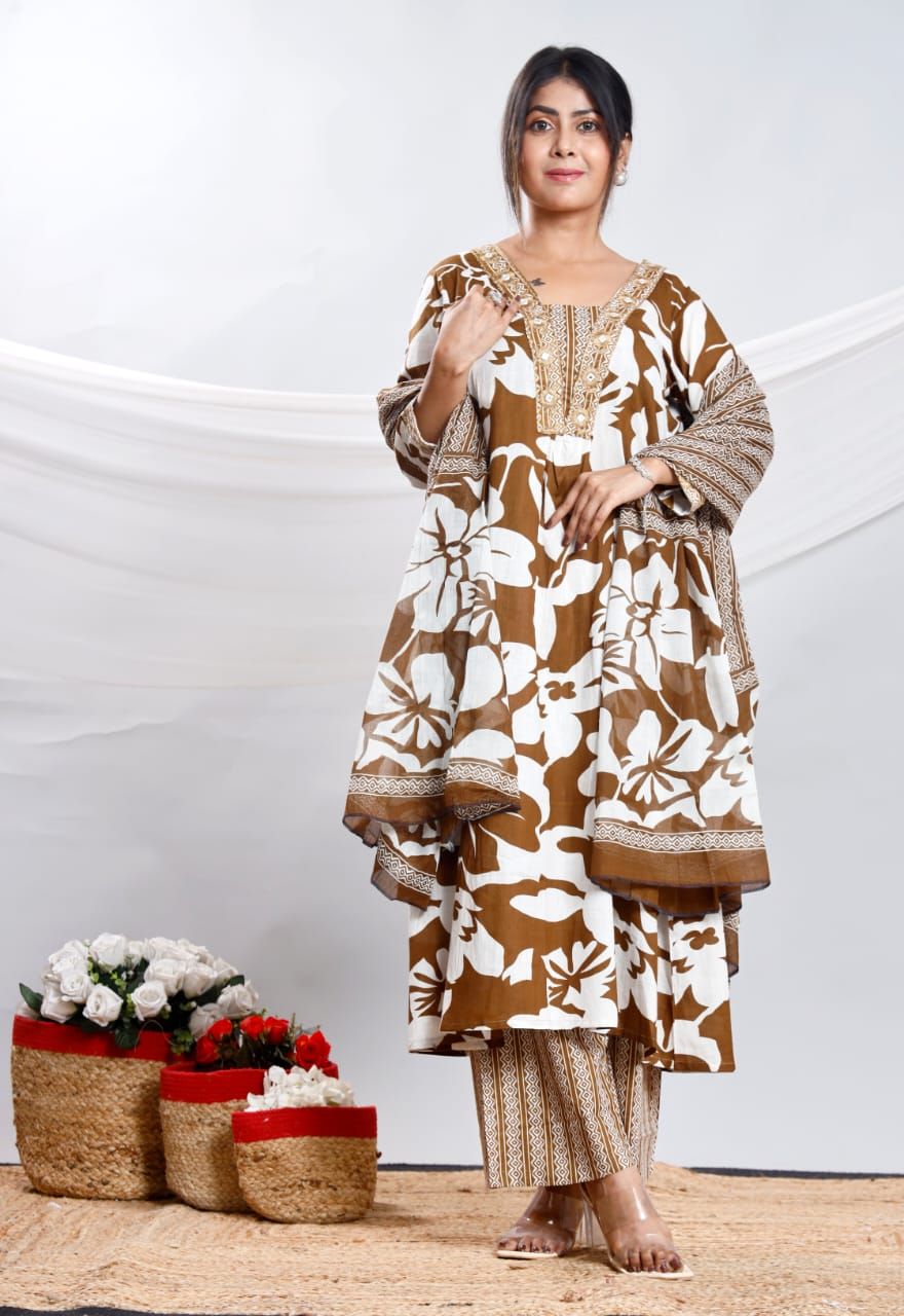 We offer a stunning Ladies Brown Floral Stripe Dupatta Suit crafted from a soft cotton blend fabric. This elegant suit features a beautiful floral and stripe combination in brown with white accents, perfect for ethnic and festive wear. The regular fit suit comes with full-length sleeves, an embroidered round neck, and vertical stripe trousers. The coordinated dupatta completes the look with its floral and stripe design. Ideal for various occasions, this calf-length suit is a must-have for your wardrobe. Supplier and trader of high-quality ethnic wear.