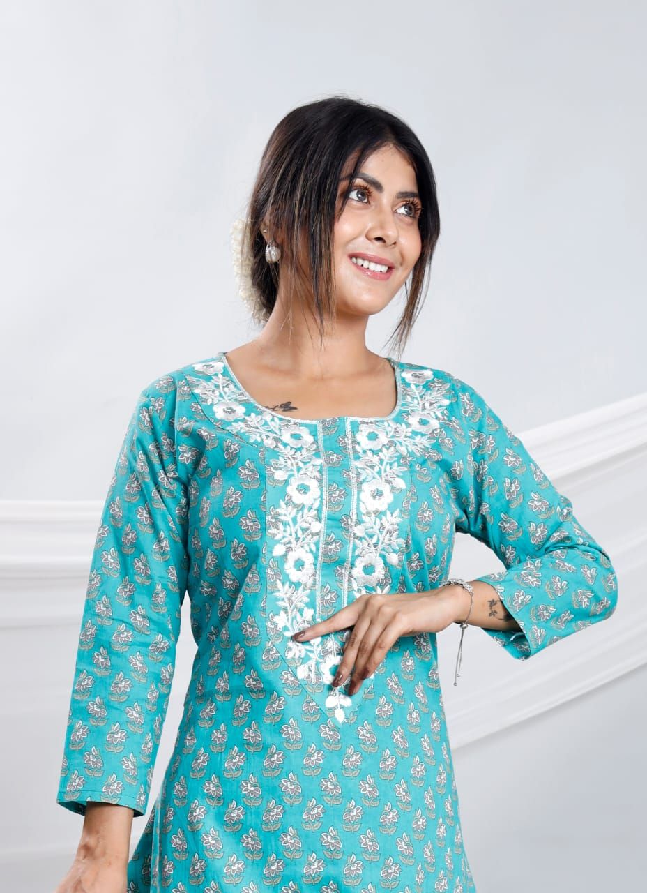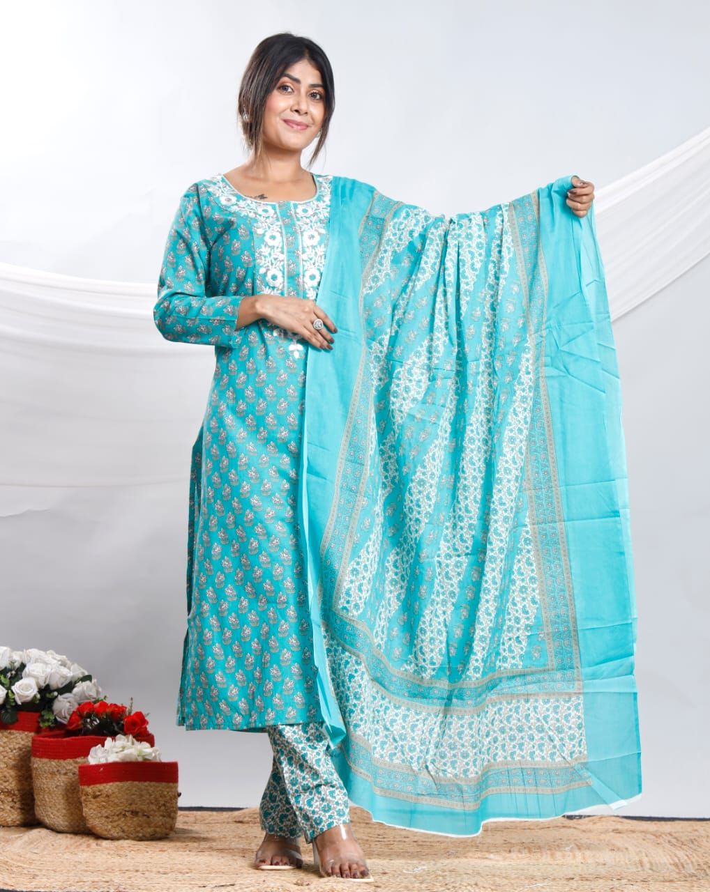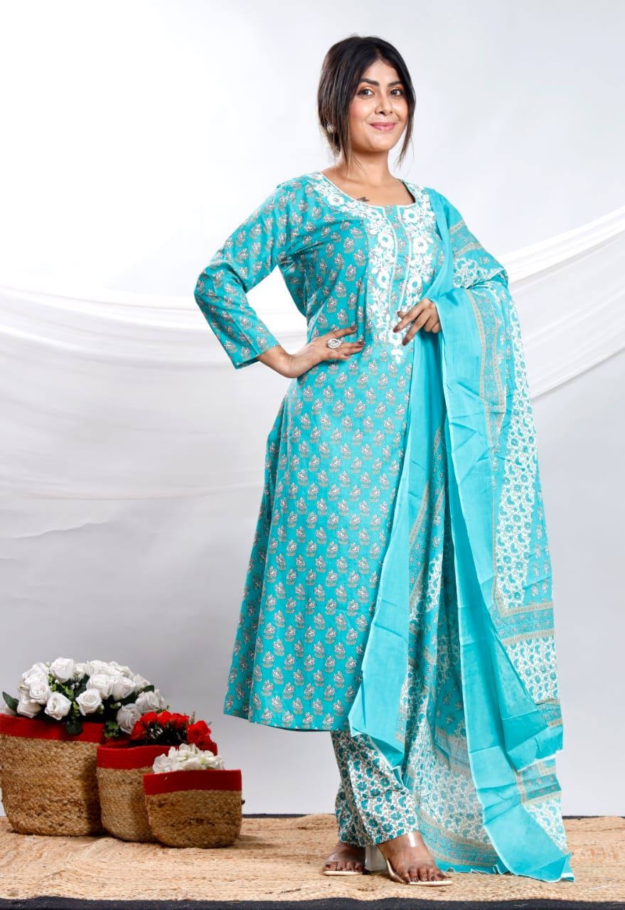 We offer a stunning Ladies Turquoise Motif Dupatta Suit crafted from a soft cotton blend fabric. This elegant suit features white floral and geometric motifs on a turquoise base with white accents, perfect for festive and ethnic wear occasions. The regular fit suit comes with three-quarter length sleeves, a square neck with embroidery, and printed straight pants. Complete with a coordinated white motif border dupatta, this calf-length suit exudes grace and style. Ideal for those seeking a sophisticated and chic ensemble for special events. Supplier and trader of high-quality ethnic wear.
