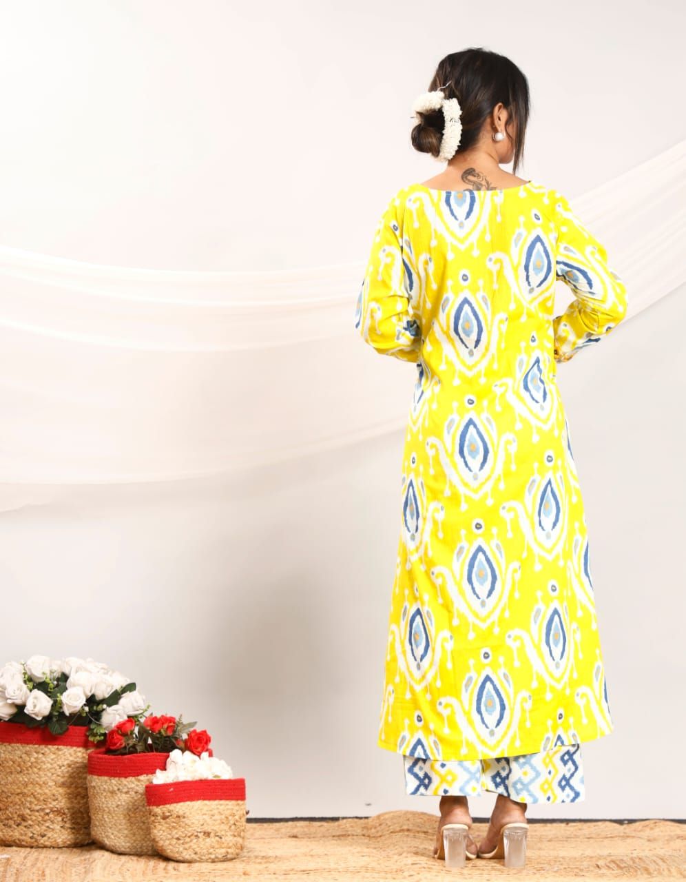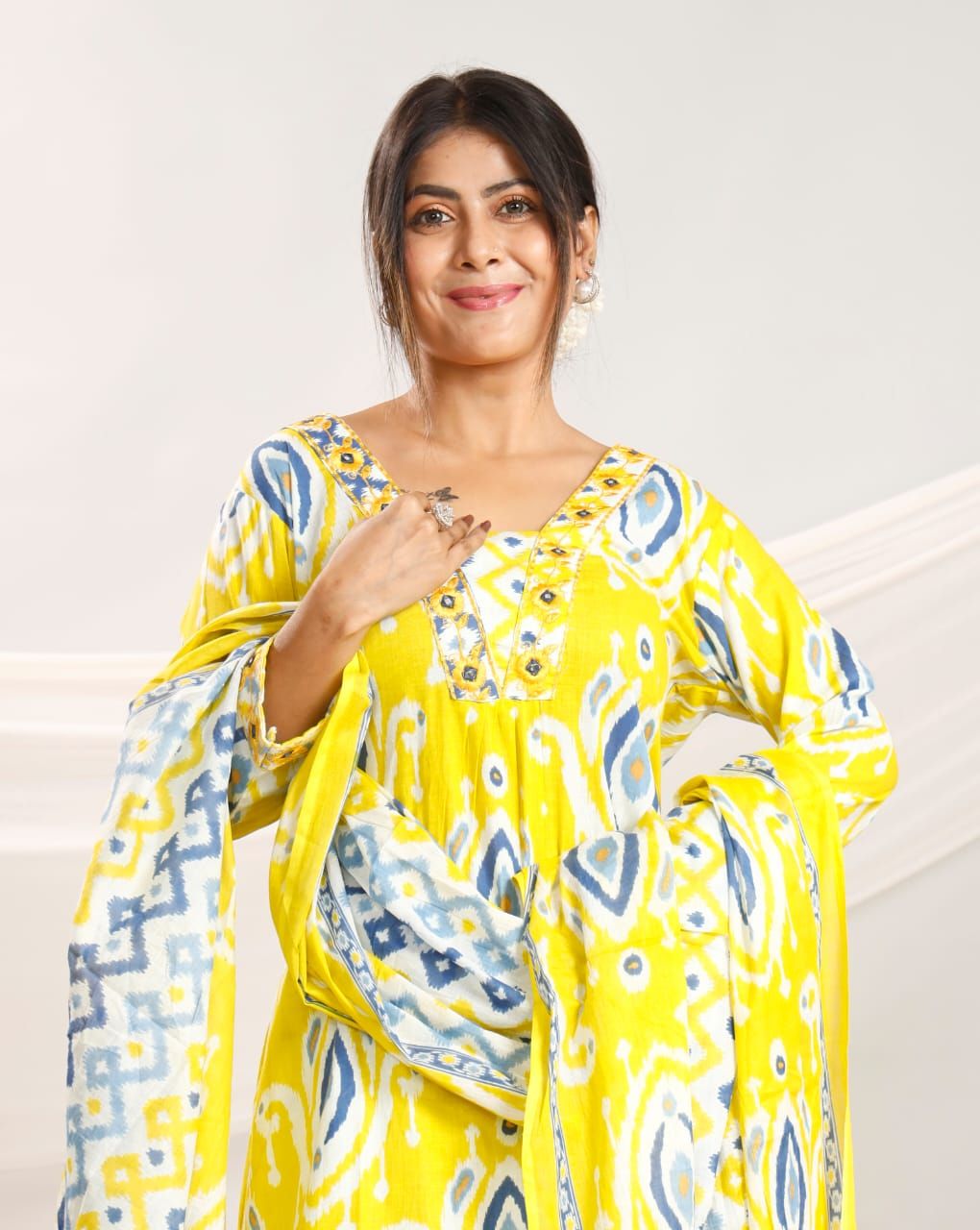 We offer a stunning Ladies Mustard Ikat Palazzo Suit crafted from a Cotton Blend fabric in a vibrant Bright Yellow hue with Blue and White accents. This Palazzo Suit features an elegant Ikat Print, Full-Length sleeves, and a V-Shaped neckline, perfect for festive and ethnic wear occasions. The Regular fit and Palazzo Pants bottom style ensure comfort and style. Complete the look with the Blue and White Geometric Dupatta design. Ideal for suppliers and traders looking to add a touch of traditional charm to their collection.