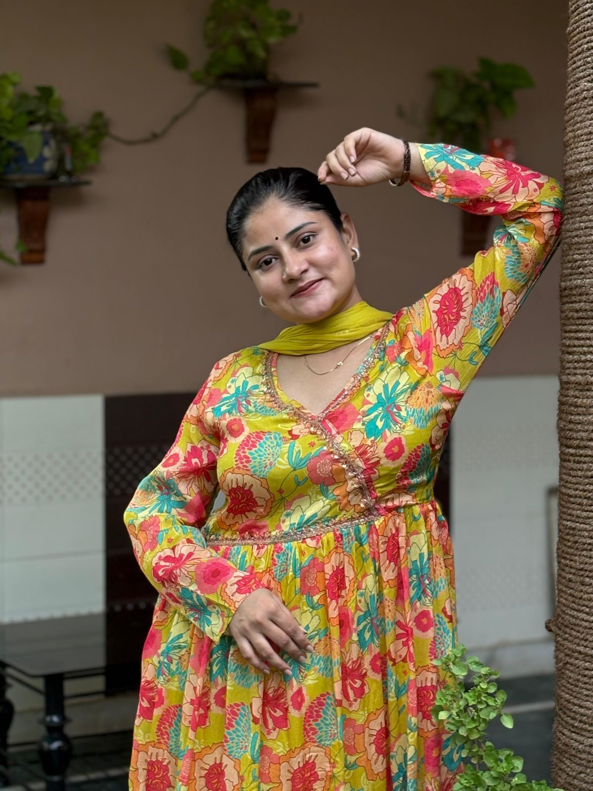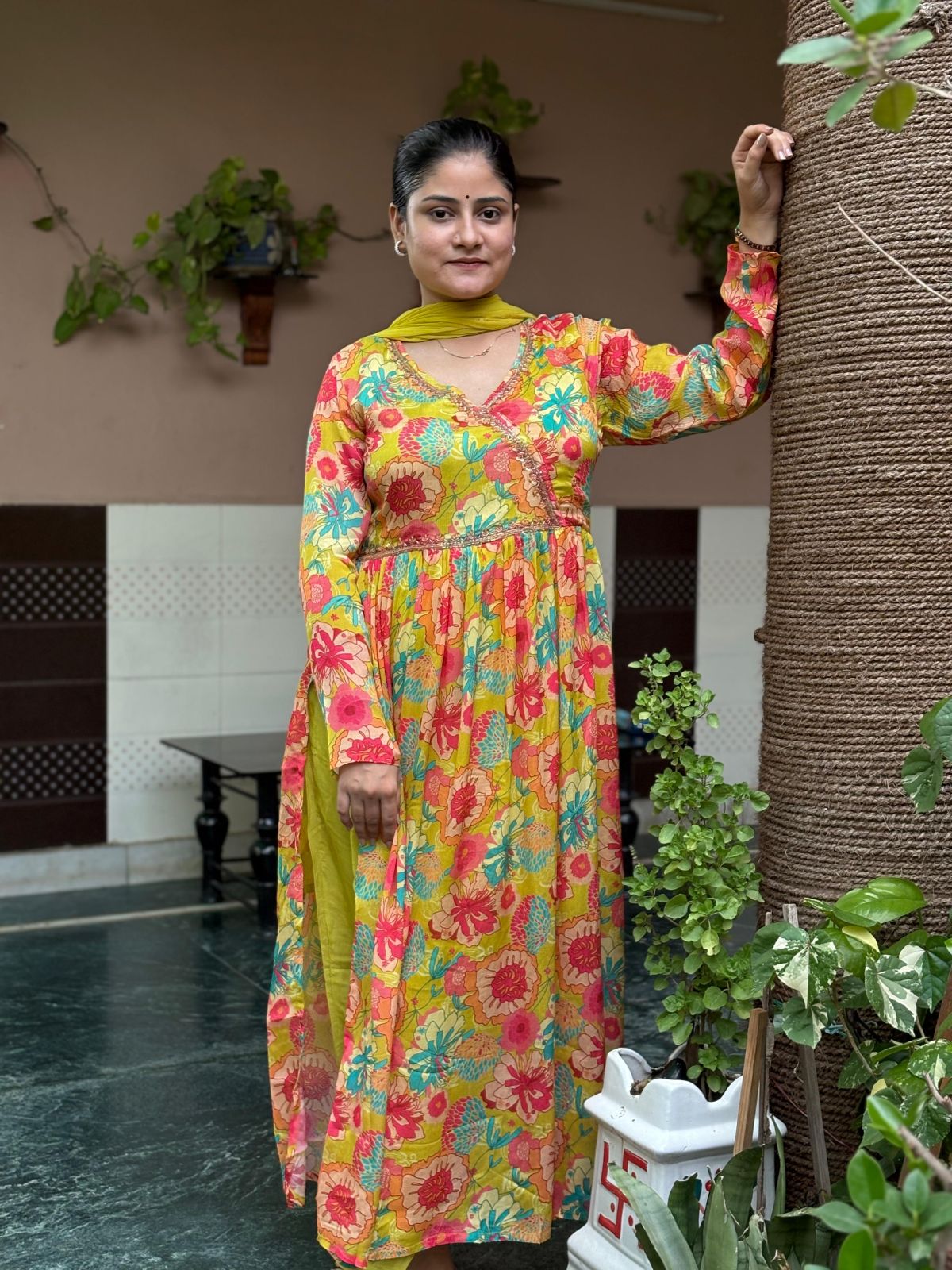 We offer a stunning Ladies Multicolor Floral Dupatta Anarkali Suit crafted from a soft cotton blend in a vibrant yellow base with multicolor accents. This outfit features a red pattern, perfect for festive and outdoor wear. The flared Anarkali silhouette ensures a flattering fit, complemented by full-length sleeves and a V-neck with intricate embroidery. Paired with printed straight pants, the coordinated floral dupatta with a yellow border adds a touch of elegance. This full-length ensemble is ideal for those seeking a stylish and comfortable outfit for any occasion.