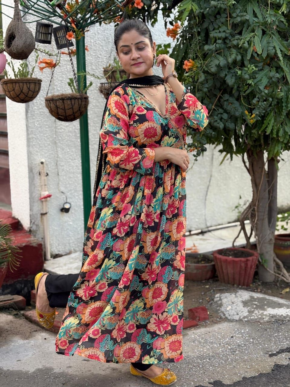 We offer a stunning Ladies Multicolor Floral Black Dupatta Anarkali Suit crafted from a soft cotton blend fabric. Featuring a large multicolor floral print on a red base, this outfit is perfect for festive and outdoor wear. The full-length sleeves and flared Anarkali fit add a touch of elegance, while the round neckline and solid black straight pants complete the look. The black dupatta with coordinated floral accents adds a stylish finish. Embrace the beauty of this full-length ensemble that exudes grace and charm.